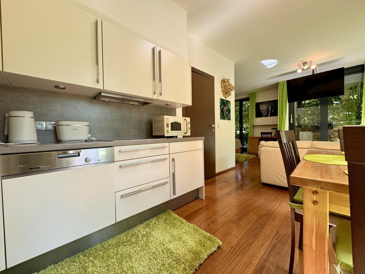 Apartmány mají plně vybavenou kuchyň se spotřebiči Miele, dvojitá okna s hliníkovými rámy, dřevěné podlahy, koupelnové vybavení a toalety od značek Villeroy & Boch, Každá místnost má STA, ST systém řízení osvětlení iLIGHT, satelit SKY a ASTRA.